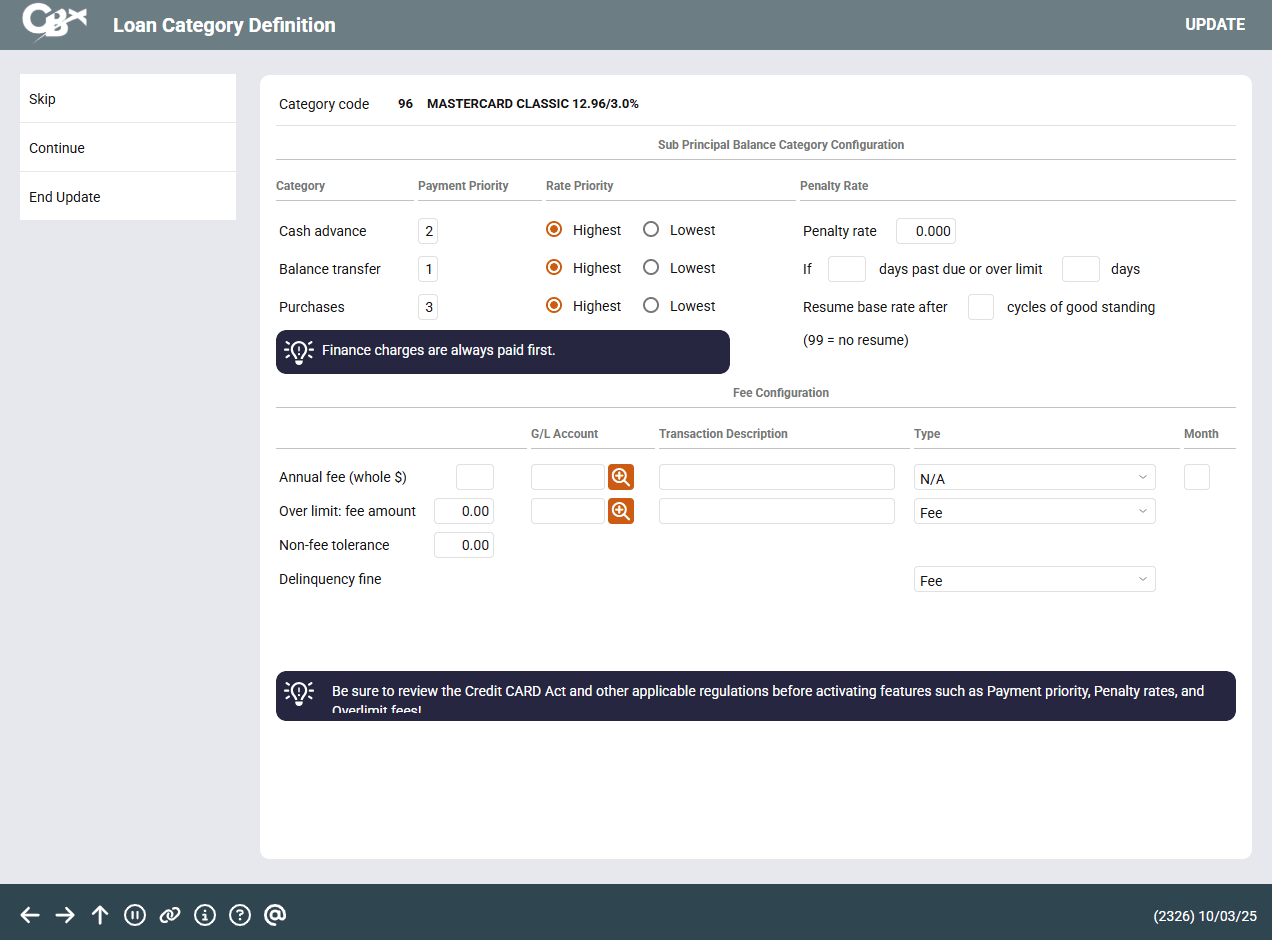 This screen controls how payments will be applied across the various charge types, including Purchases, Cash Advances, and Balance Transfers. These are also referred to as “buckets” or sub-principal balance categories and are used to track a member’s credit card transaction activity. Each charge type or bucket can have its own rate, and this screen lets you decide which charges will be paid first by charge type and rate. In addition, this screen lets you set up parameters for various fees that can be charged to member credit card accounts.
