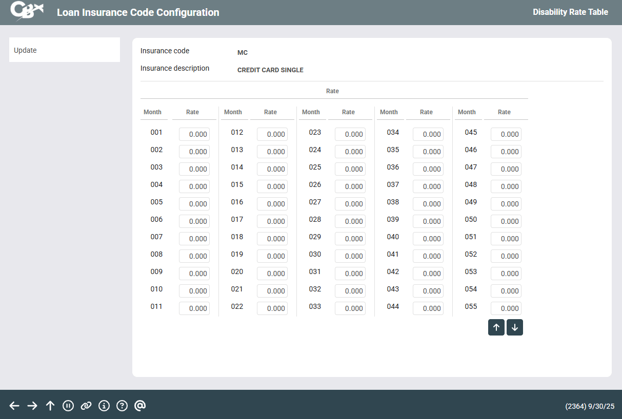 Use this screen to enter monthly credit disability and life insurance rate information. The source for data entry should be a rate table provided by your insurance company or other vendor.
