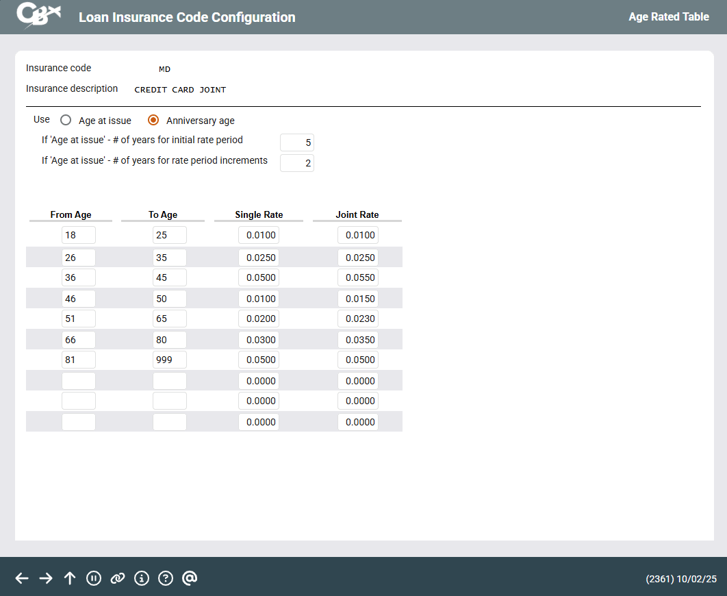 CAUTION: Contact CU*Answers for assistance before configuring age-rated life insurance! In addition, if your credit union currently has separate insurance codes configured for each age range, preparation and testing will be required to implement the transition to a single code.