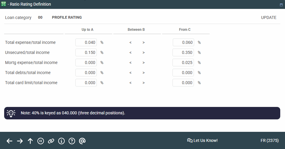 If this screen was accessed during loan category configuration, a loan category will be shown in this field. Any changes to the ratio ratings on this screen will affect that loan category only. If this field shows loan category “00,” any changes to this screen will affect all loan categories, except for those loan categories configured separately. |