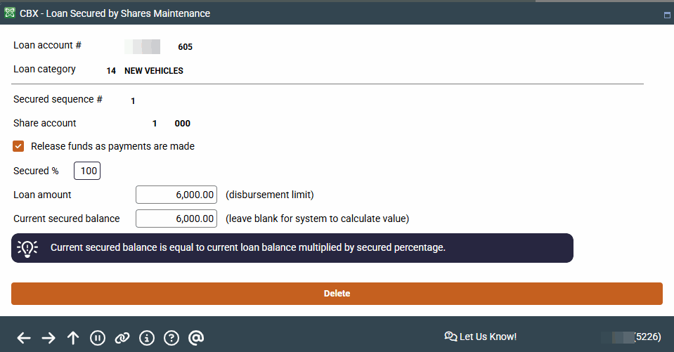 For new records, leave this field blank and the system will calculate the amount which is secured from this account by multiplying the Loan amount by the Secured percentage. If this is an existing loan for which payments have already been made, this field shows the amount currently secured from this share account. This may also be different from Loan amount if the record is set up to release funds gradually as the balance of the loan goes down. |