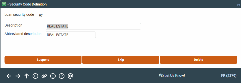 Use this to suspend the security code so that it can no longer be used in creating new loans. Return to this screen and use Enter to reactivate the code. |