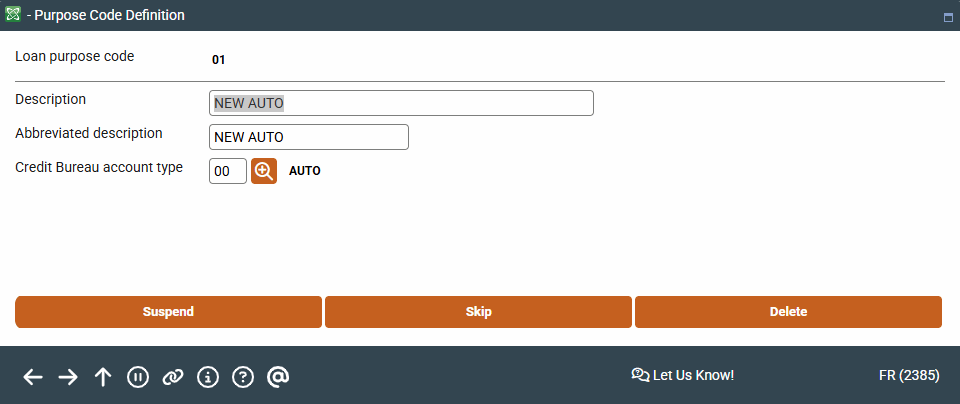 This is the second screen used to create a loan purpose code. When done, use Enter to save the changes and return to the first screen.