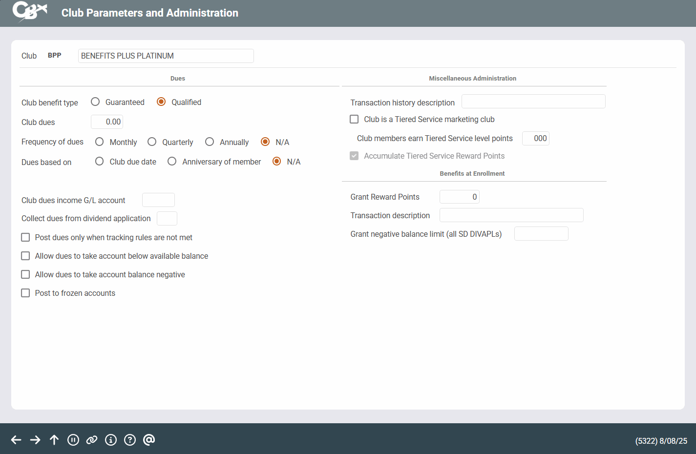 These screens are used to set up eligibility requirements, fees, and rewards for Marketing Clubs. For complete details on using these screens, refer to the booklet, Marketing Clubs: Configuration, Benefits and Enrollment.