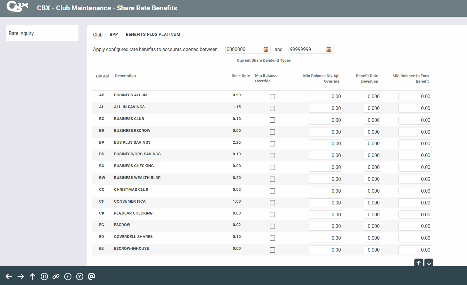 | Screen Title: | Club Maintenance - Share Rate Benefits | |