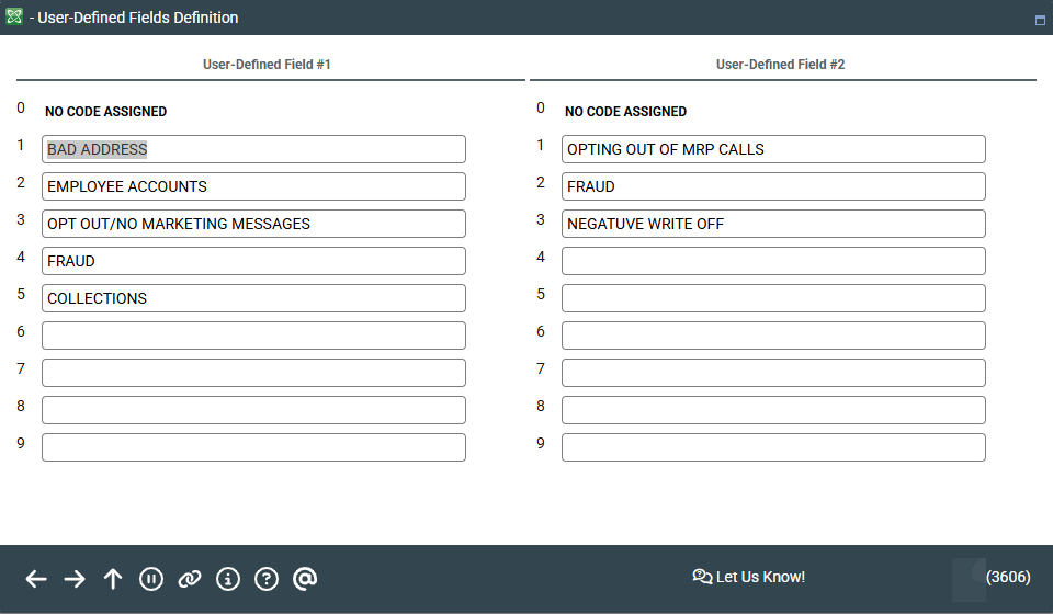 NOTE: A User Defined Code does not need to have a definition in order to assign it to a member account. The definitions are simply for convenience so that others on your CU staff can see what the code numbers were intended to represent.