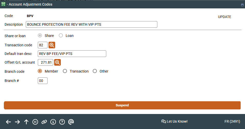For example, you could set up a code to refund NSF fees. The code would define your fee income G/L for the offset and the default transaction description you want to use for consistency. When an MSR or other staff needs to perform that type of adjustment on a member account, he or she simply chooses the appropriate code, enters the amount and posts it.