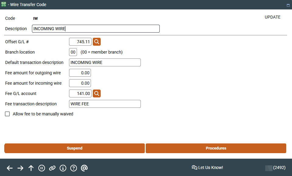 Enter the fee amounts to be used when posting both outgoing and incoming wires using this code. The fees can be the same or different, or you could leave either of them at $0.00 to charge no fee. |