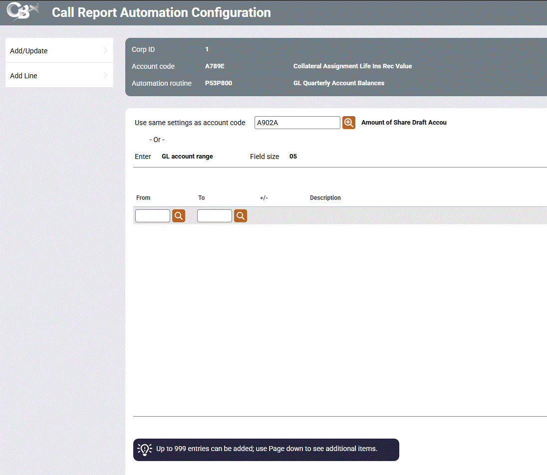 This screen is accessed from the 5300 Call Report Data screen after you have selected an automation routine. Use this screen to configure the data (G/L, purpose codes, etc) for the Account Code based on how your credit union has organized their data in CU*BASE. Depending on the automation routine, you may be able to enter single values, a range of values or a combination.