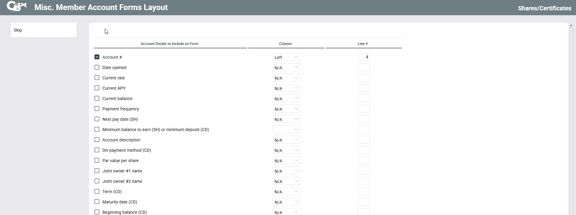 Access this screen by checking "Share/CD account details" on the previous Miscellaneous Member Account forms layout screen.