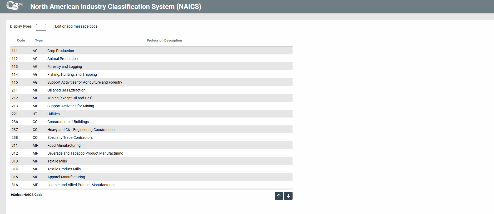 Select a North American Industry Classification System (NAICS) code from the list and then use Select to return to the first fill-in CTR screen.