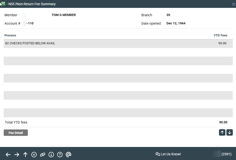This screen shows a summary of fees charged year-to-date to member checking accounts for: