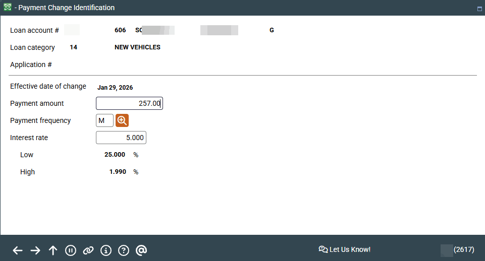 (Does not appear on credit card loan accounts.) Enter the interest rate to be charged on the loan as of the effective date. A low and a high range are provided as a reference. |