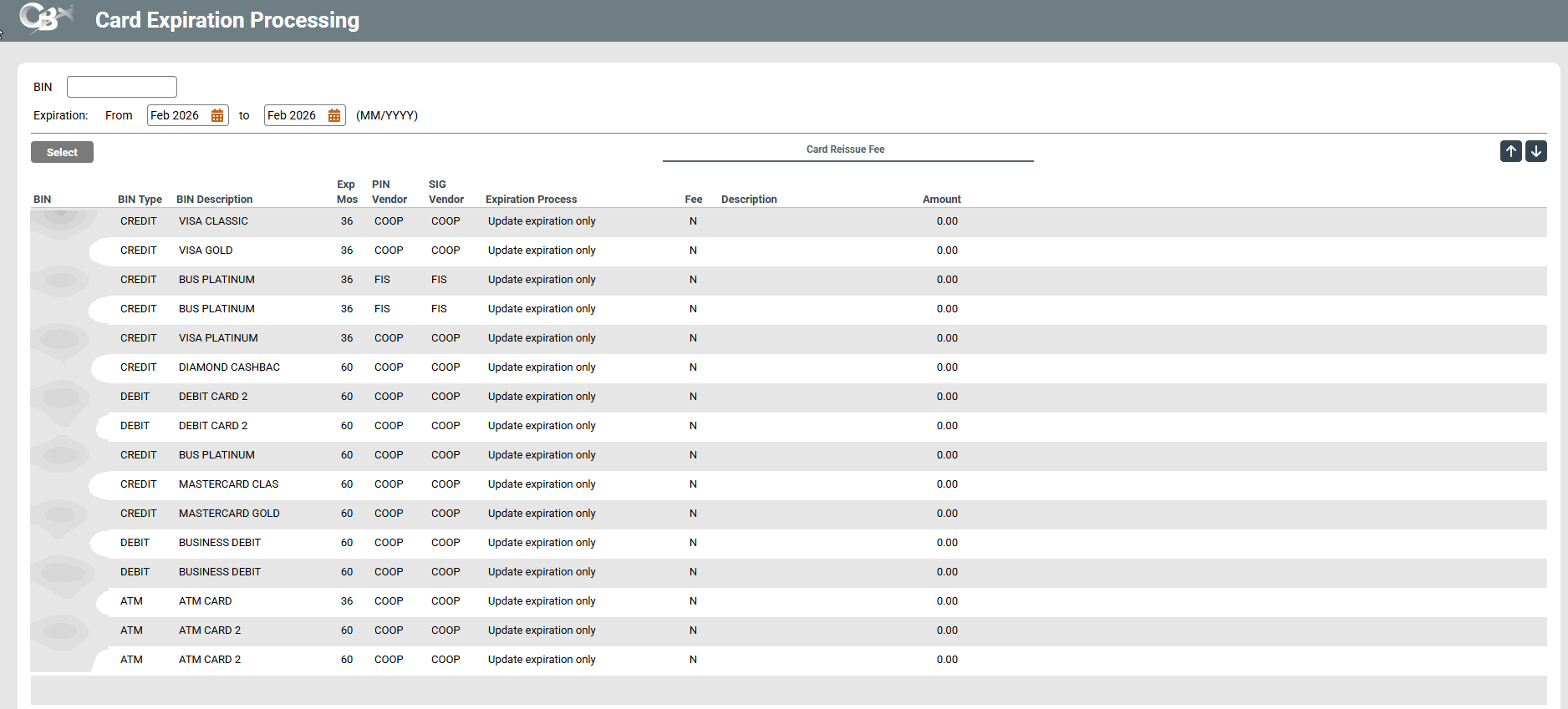 This tool is for use by credit unions who have a vendor relationship with a vendor that accepts vendor ressiue/expiration files. This tool allows those credit unions to update ATM, debit, and credit card expiration dates in a batch, using a range of expiration dates, allowing the user to verify which cards should actually be reissued. Credit unions can charge a fee for the reissue of these cards; fees can be set up for individual BINs but also have the capability to be waived per member.