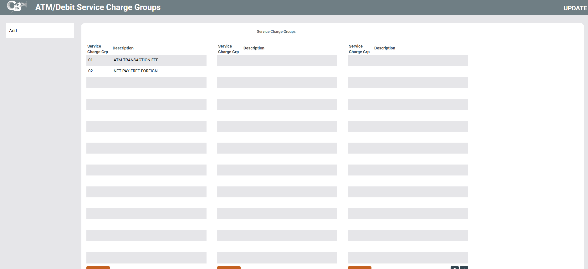 When ATM and Debit Cards are created, a default service charge group is assigned, but you may change it to any of the groups configured here.