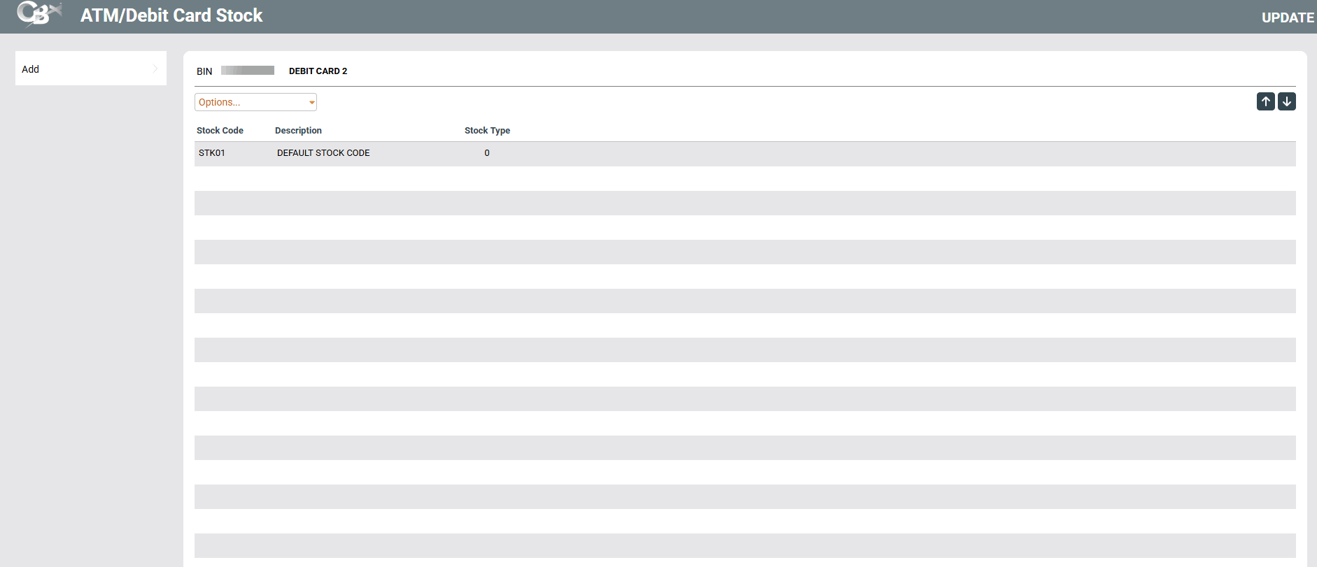 Select a card stock and the Select option to move to the detail of the ATM/debit card stock configuration detail.