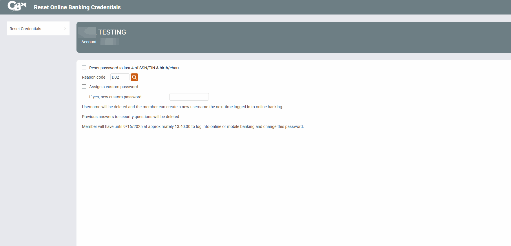 Click Reset Credentials to finalize the reset of any online banking credentials.