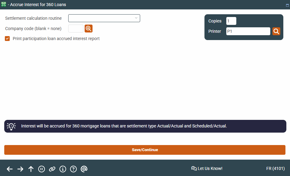 Access this screen byselecting Tool # 107: Accrue Interest for 360 Loans.