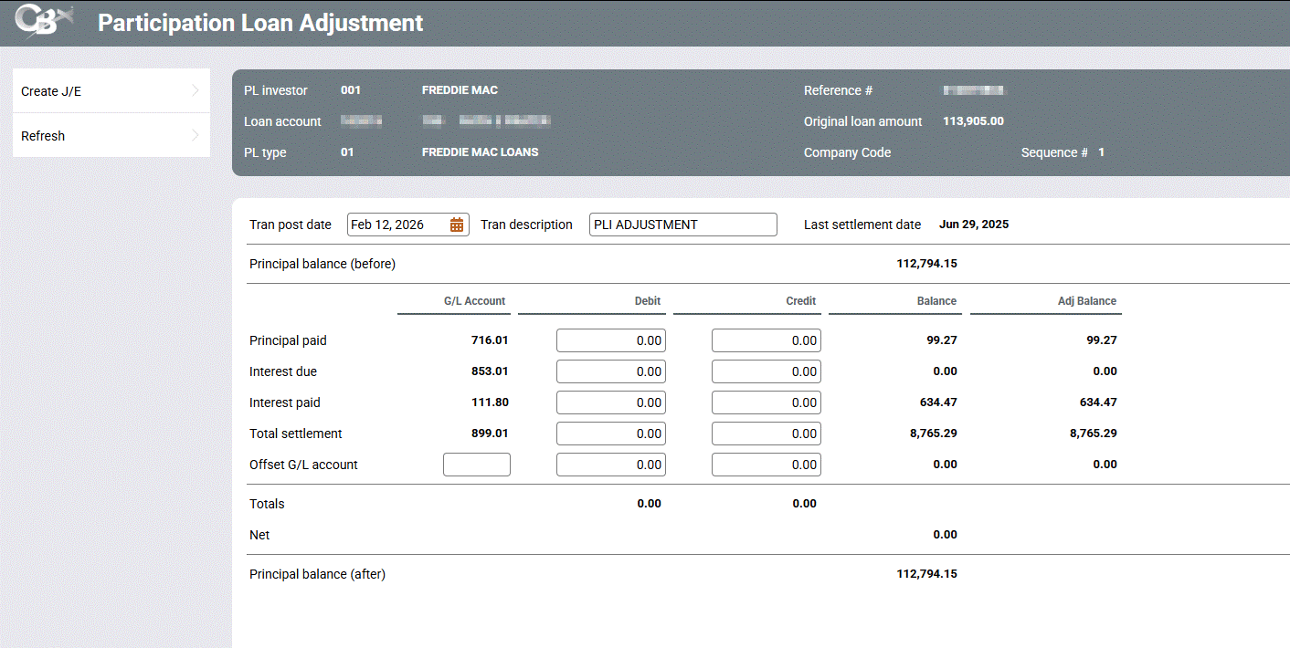 When done, use Enter to refresh the screen and check for any errors. Note: The Principal Balance (After) will reflect the updated balance to be posted. Then use Create J/E to post the transaction to the participation loan and create a journal entry batch that gets posted to the G/L.