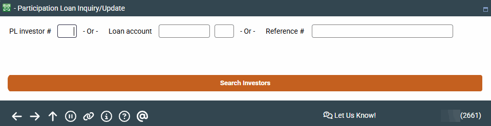 This is the first of several screens used to add, view or work with participation loan accounts. You can attach loans to investors, view an investor’s current position on a loan, review settlement history on loan accounts, and post adjustments to the participation loan records.