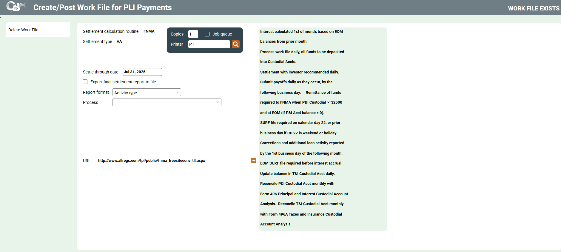 The routine that determines how the settlement amounts get calculated when a work file is processed. Valid settlement calculation routines are FNMA (Fannie Mae), FHMC (Freddie Mac), FHLB (Federal Home Loan Bank), PART (standard 365 participation loans), and P360 (other 360 mortgage loans). |