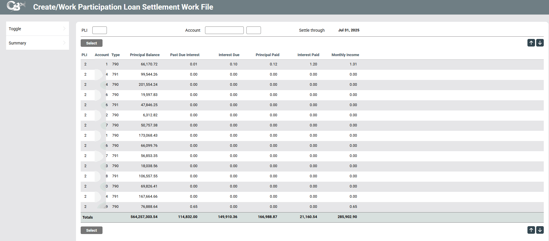 Use this screen to view the contents of this work file before it is posted to the participation loan general ledger. You can modify interest and principal amounts in the work file. Changes made here will affect only this work file. If this work file is deleted before posting and later recreated, the changes will be lost.