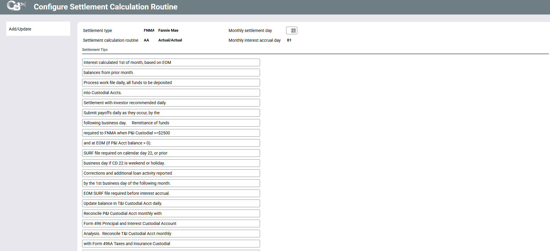 The configuration also contains free form fields that can be used to enter tips specific to the Settlement calculation routine.
