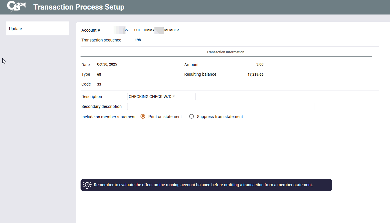 Print of Member Statement: Select this option to have the transaction included in the member's statement. Suppress from Statement: If this transaction is a transaction reversal or account adjustment, this option can be selected so that this transaction does not appear on printed member statements or in audio response/online banking. It will still appear in the core transaction history inquiry. However, be careful that you understand how suppressing a transaction from a statement will affect the running balance totals shown for the account. When in doubt, always have the transaction appear on the statement. SEE ALSO: Blocking Transaction from Appearing on Member Statements |