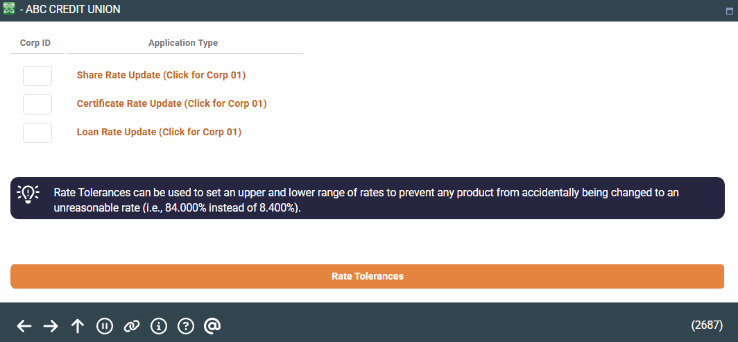 This is the first of several screens used to update dividend rates for share type accounts and certificates for both online. It is also used to update the loan interest rates that are shown when using the Rate Inquiry feature to quote loan rates to members.