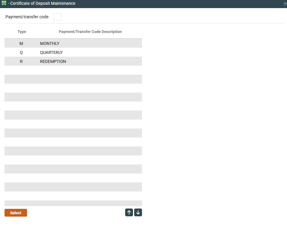 This is the first of two screens used to set up the dividend payment frequency codes that are attached to CD Applications. Enter a one-character alphabetic code and use Enter to proceed to the next screen.