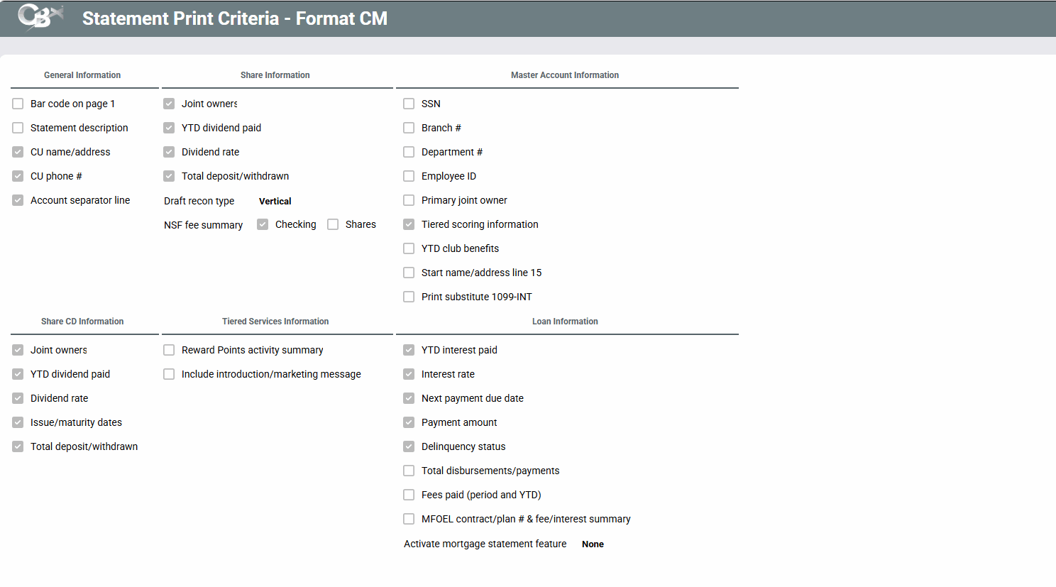This screen controls how the printed statements should look when using this code. For example, for privacy reasons you may wish to omit the member's Social Security number from printing on the statements, or you may choose whether or not to print joint owner names on statements.
