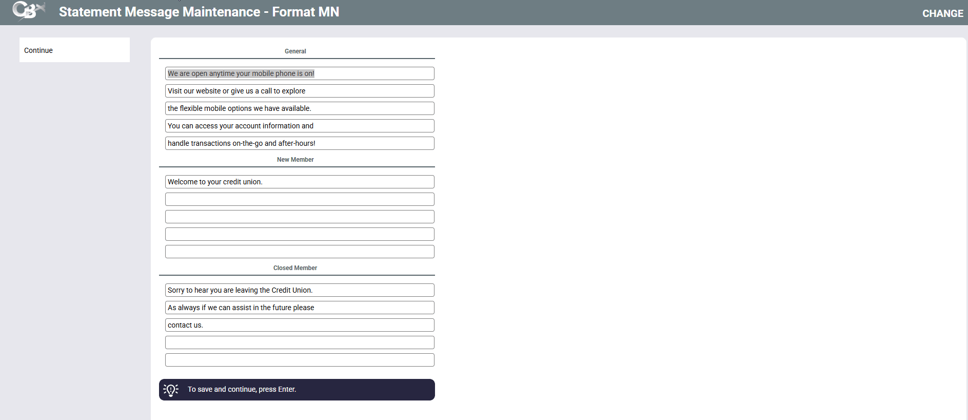 Although you must complete the statement insert instructions (next screen) no later than the 10th, you may adjust the statement messages on the second screen at any point until the statements are actually generated at month-end.