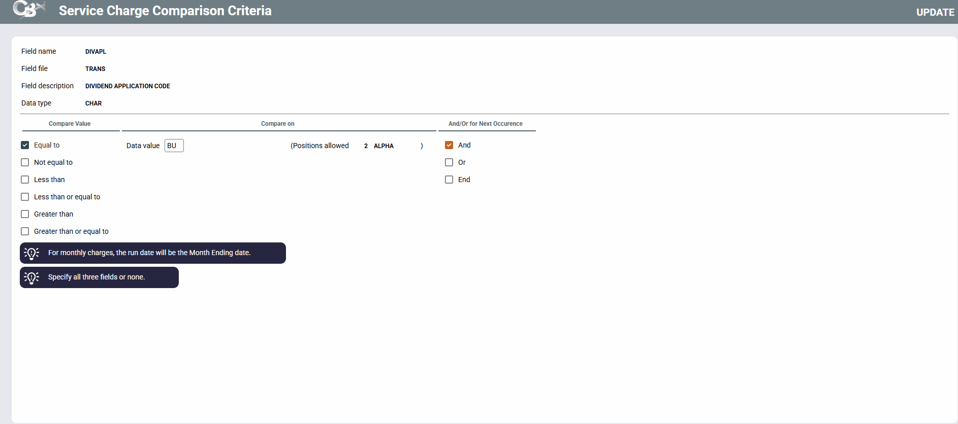 You have two options, to leave these fields blank. If these fields are left blank and it is a monthly charge, the comparison will be as of end-of-month. If they are left blank and it is a daily charge, the comparison will be run at end of day.