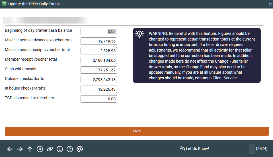 WARNING: Be careful with this feature. Figures should be changed to represent actual transaction totals at the current time, so timing is important. If a teller drawer requires adjustments, we recommend that all activity for that teller be stopped until the correction has been made. In addition, changes made here do not affect the Change Fund teller drawer totals, so the Change Fund may also need to be updated manually. If you are at all unsure about what changes should be made, contact a client service representative.
