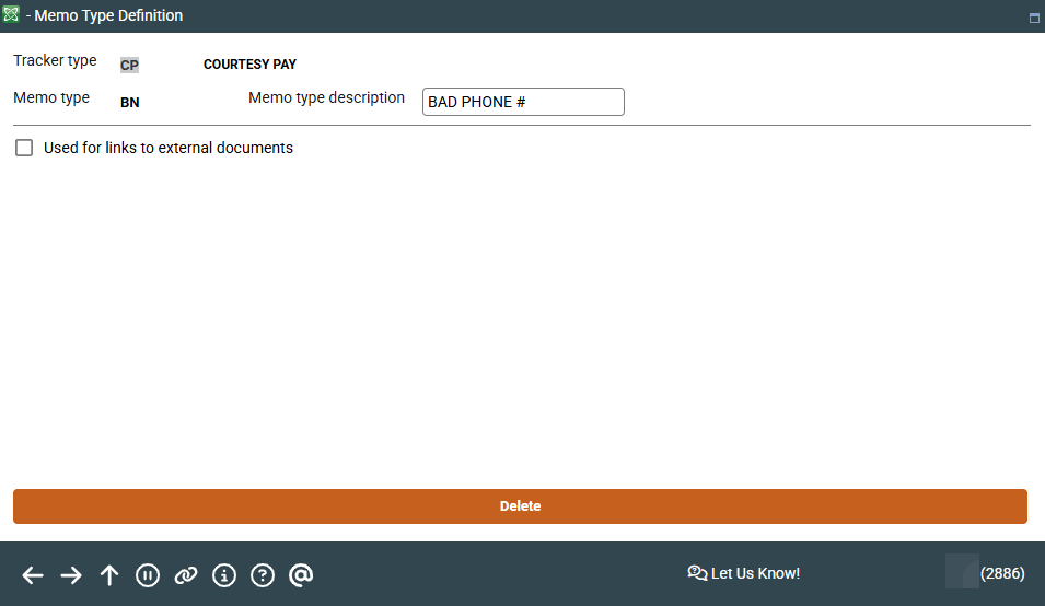 This feature is for Memo Types associated with a Collections Tracker (XX) only. For Memo Types associated with a Collections (XX) Tracker, you will also have the option of checking "Used to monitor account daily for specific transaction activity (e.g. Promise-to-Pay)." If you check this box, and create the appropriate Tracker conversation, the core will monitor for member deposits, such as Promise-to-Pay transaction. Learn more in the Configuring Tools for Collections booklet.