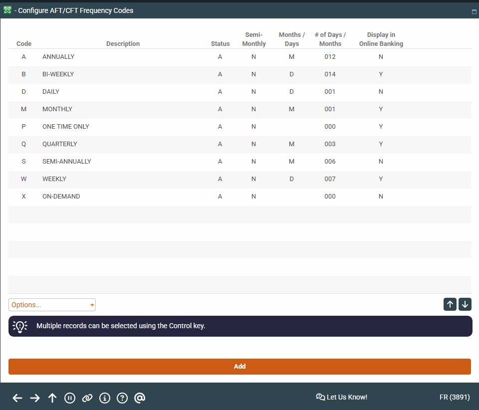 This is the first of two screens used to configure frequency values that are used by the Auto Funds Transfer (AFT) and Check Funds Transfer (CFT) systems, such as “Weekly” or “Monthly” or other commonly-used periods of time. You can also specify which of the codes will be available to members when setting up automated transfers in online banking (if allowed).
