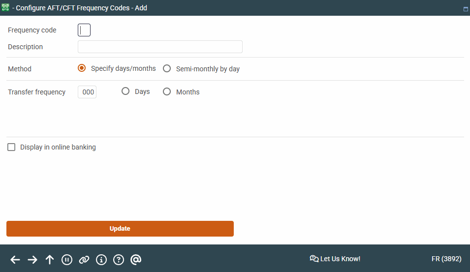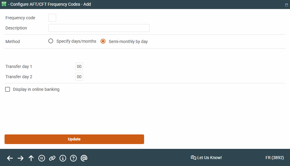 If you allow your members to update AFT and/or CFT records in online banking, the Display in online banking field is used to specify which of your frequency codes can be chosen by members. It is a good idea to use this to deactivate any specialty frequency codes such as “One Time Only” or “On Demand” which might be confusing to members and cause records to be set up incorrectly.