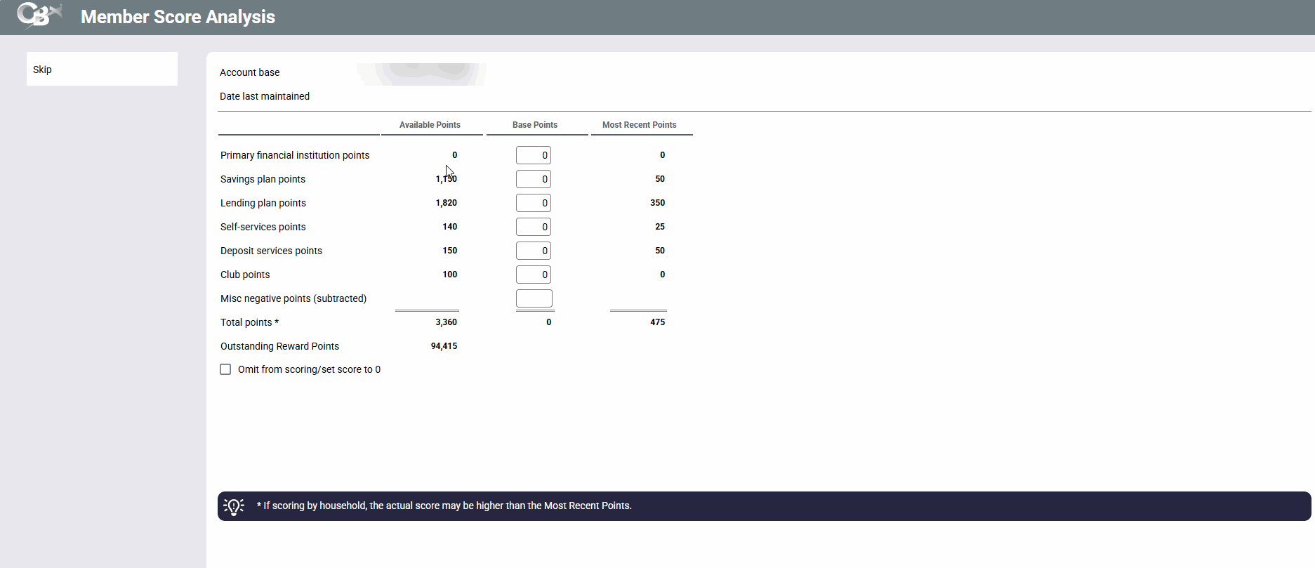 You can also use the Omit from scoring/set score to 0 option for special situations where a member’s behavior or relationship with the credit union warrants his or her exclusion from the Tiered Services program entirely (such as a written off OTB credit card account or bankruptcy, for example).
