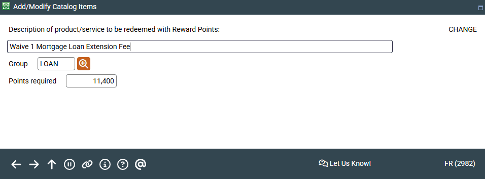Enter a description, a group code (see next page for more information about setting up group codes), and the number of points that must be redeemed to obtain this product or service. Use Enter when done to save.