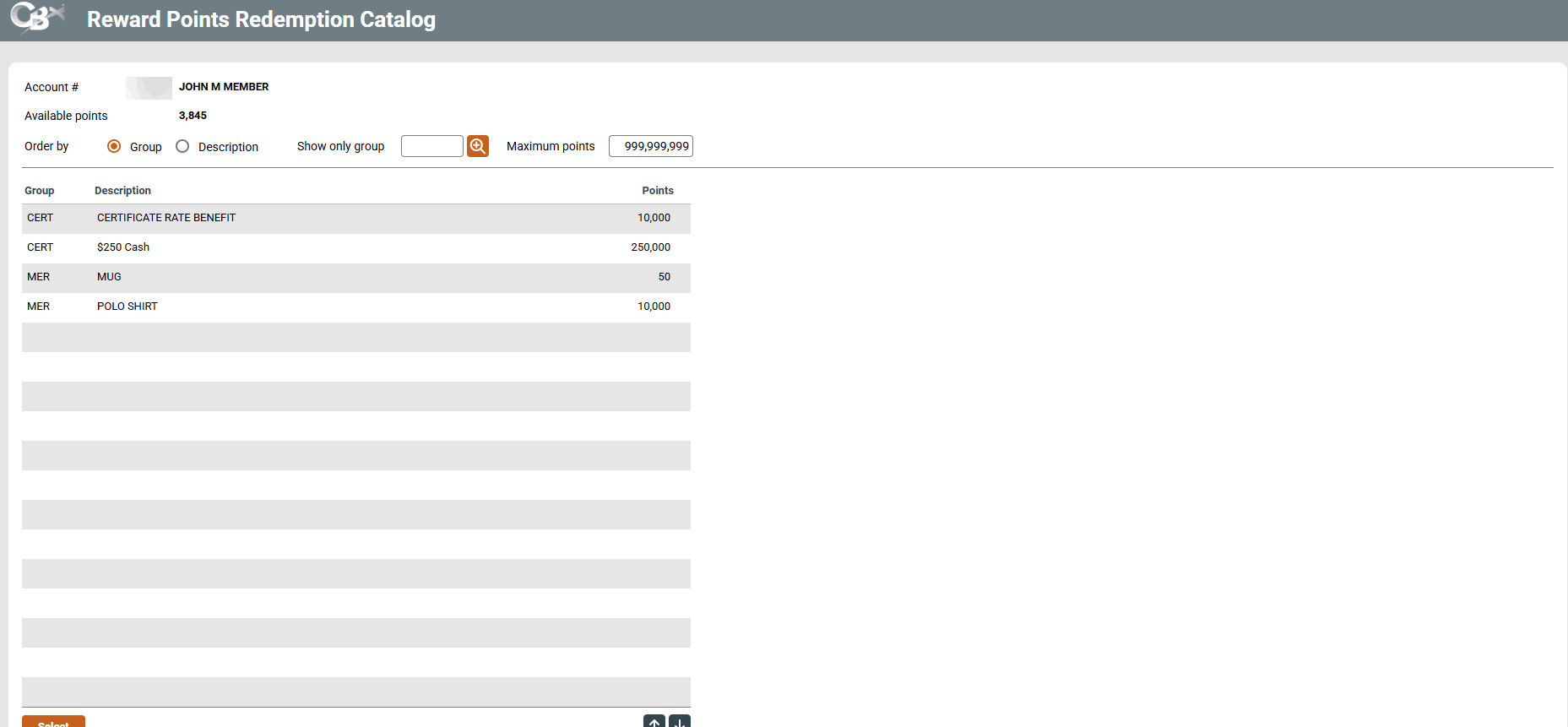 This screen shows the catalogue of products and services that your credit union has configured in its Lifetime Points Catalogue and allows you to redeem points for a member. Select a product or service from the list and Select to access this screen where you can make a selection.