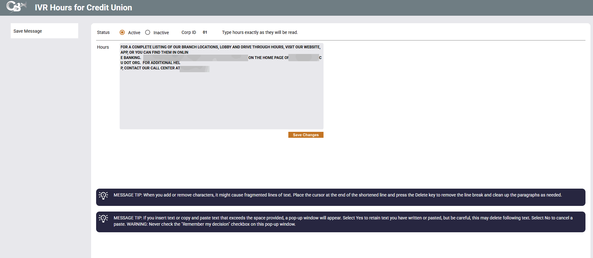 IMPORTANT: This screen is used only for credit unions that have activated text-to-speech IVR features. The text-to-speech option automatically reads the greeting and credit union hours/locations messages from these configuration screens, rather than playing separate pre-recorded messages. Contact a CSR if you wish to convert to the text-to-speech method for CU*TALK audio response.