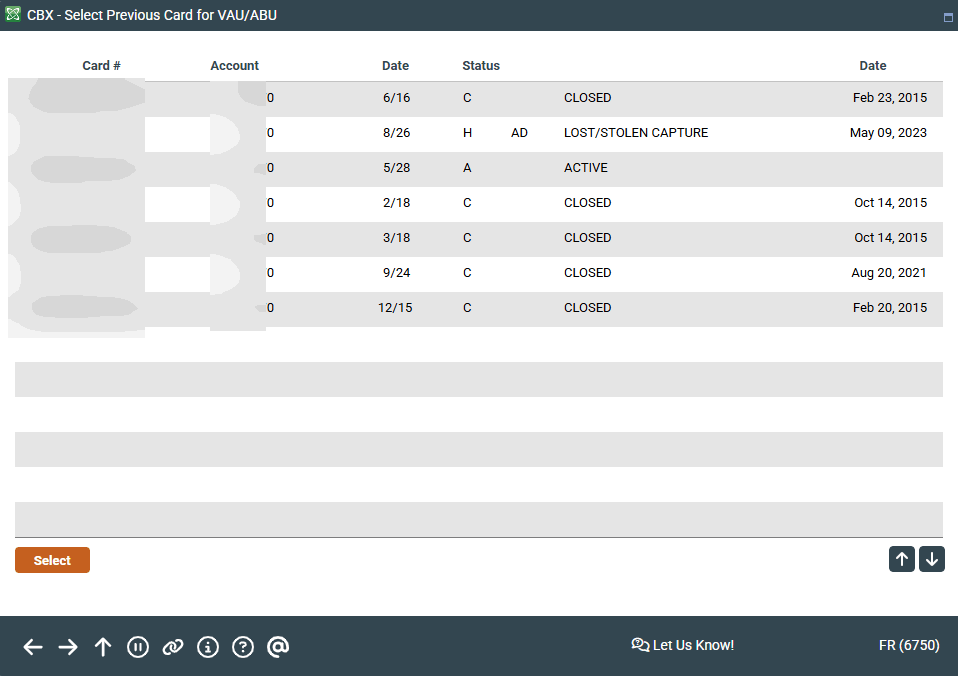 Use this screen to select the member's previous card to attach to the new card order. This option relates to the Visa® Account Updater (VAU) and Mastercard® Automatic Billing Updater (ABU) service. This service allows you to attach a previous card number on file to a new card order so that payments with merchants will still go through without issue (like Netflix).