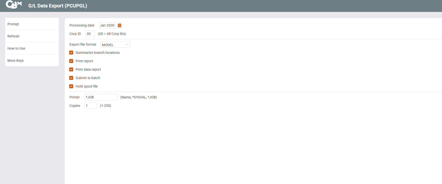This screen lets you export data from your CBX general ledger files and create a downloadable file on the iSeries in the appropriate format for your ALM tool. Remember that this step must be done every time you wish to download into your ALM package in order to refresh the file with current da
